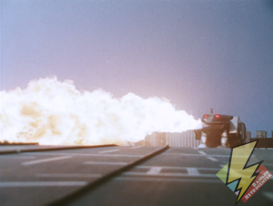 The powerful legs of the Frog Ninjazord allowed it to leap over entire city blocks with ease. The Frog could expel a jet of fire from its mouth. More unusually, the Zord could launch a fleet of mini Frog Ninjazords from within itself that would march towards an enemy and attach to them. When all mini Frog Ninjazords were attached, they would generate a net of electrical energy to shock the monster. This same attack was also used as part of the assault to destroy the giant Hate Master monster. [MMPR3: “Stop the Hate Master, Part II“]
